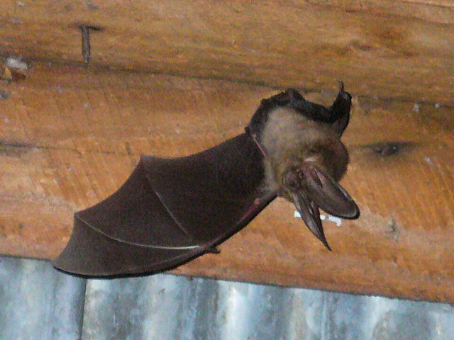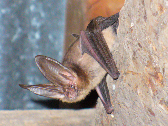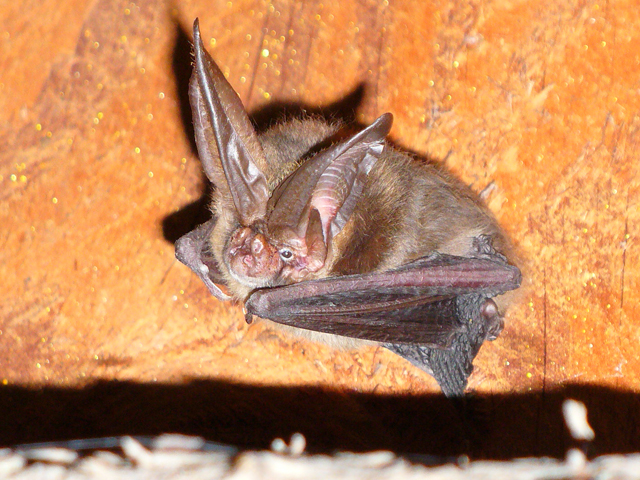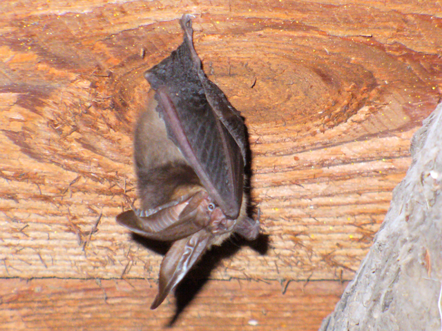 - 2007 - In my shop, there is a little Townsend's Big Eared Bat that normally hangs out in the loft area. He's a very friendly guy and occasionally flies down, does some circles around me to see what I'm doing, and goes back up to roost. I've grown quite fond of him. There are also a couple other species of bats that fly quickly inside the shop at night because I leave the doors open for them to come in and catch the bugs attracted by the inside lights. It took a while, but now I'm completely comfortable with working while bats occasionally come say hi. Sometimes, at dusk, I'll walk down the road a bit and the bats will follow me while circling and swooping down around me. In all the bat encounters, I have yet to have one actually make physical contact with me, which really shows how good they are at manuevering, and also that they don't want to "attack" people. Here's pictures of my good friend which I unfortunately had to leave behind when I moved to Winlock. Check out the "Bat Rescue" link on the left menu for more bat pictures. |